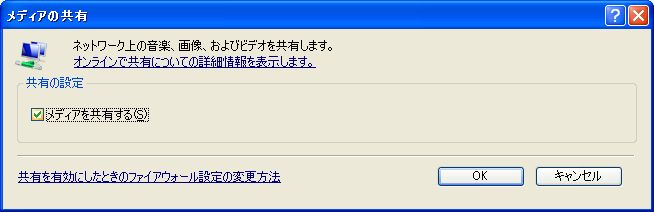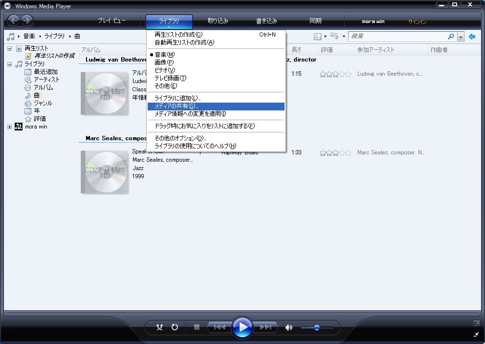 1.メディアプレーヤーの「ライブラリ」->「メディアの共有」を選択